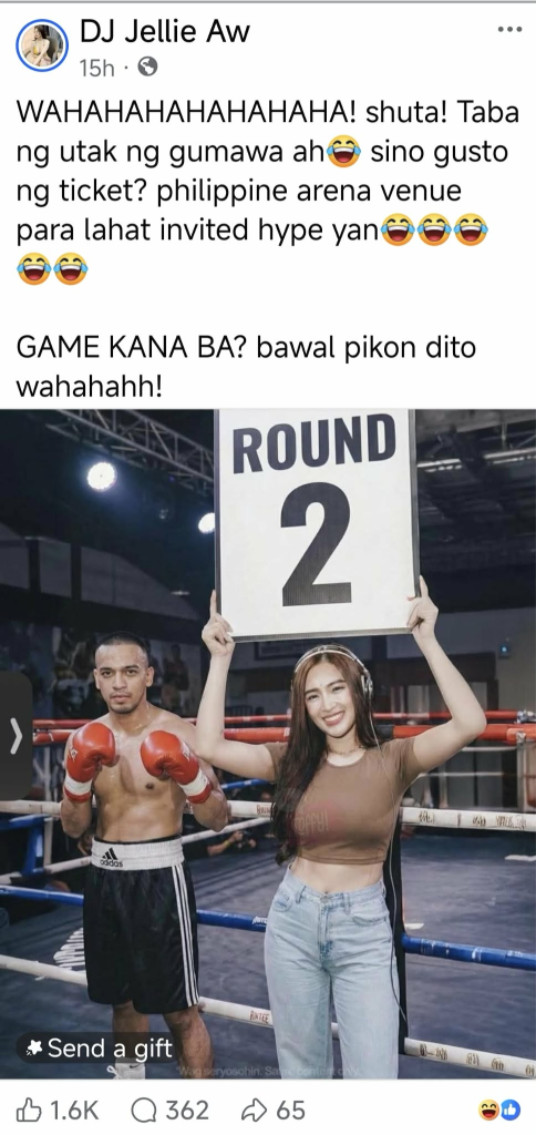 Nakasulat sa caption ni Jellie: “WAHAHAHAHAHAHAHA! shuta! Taba ng utak ng gumawa ah sino gusto ng ticket? philippine arena venue para lahat invited hype yan