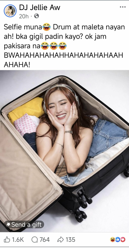 Caption ng DJ: “Selfie muna Drum at maleta nayan ah! bka gigil padin kayo? ok jam pakisara na. BWAHAHAHAHAHHAHAHAHAHAAHAHAHA!”