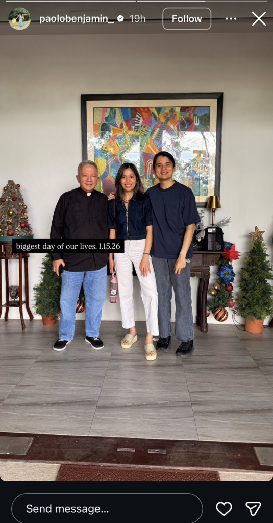 Meanwhile, prior to their wedding, Paolo shared a snapshot of himself and Rachel with Father Tito Caluag on his Instagram Stories, writing: “Biggest day of our lives. 1.15.26.”